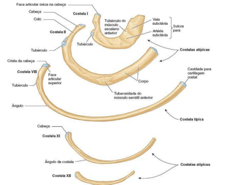 cabeça, corpo, colo e tubérculo da costela(local de fixação do ligamento costotransversário-ligação processo transverso-costela)