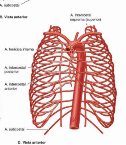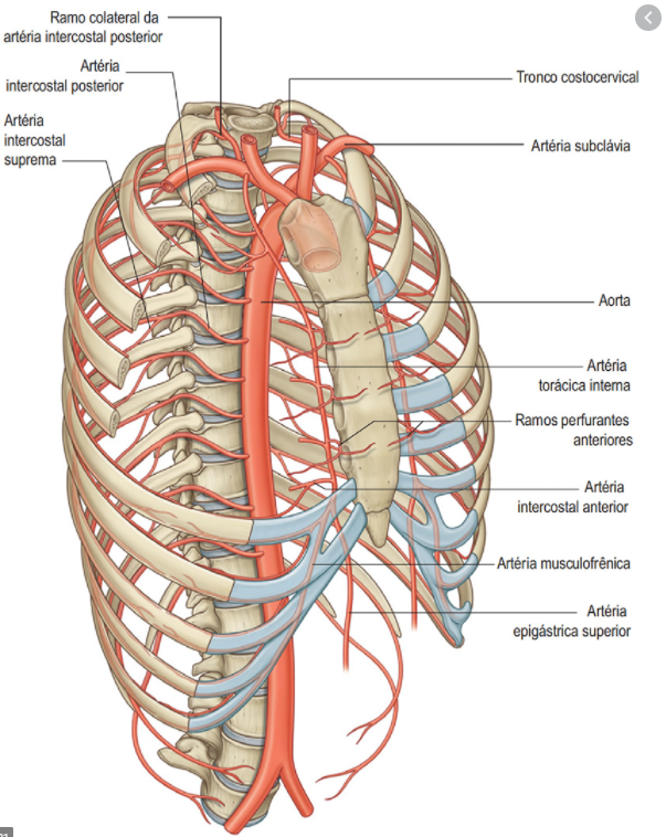 artérias intercostais posteriores: ramos da arteria intercostal suprema(1o e 2o espaço intercostal) e parte torácica da aorta