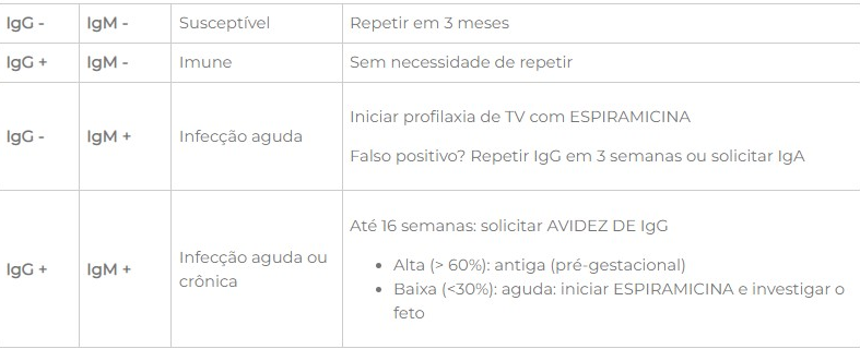 IGG/IGM(+)–>Iniciar Espiramicina–>Avidez (-)(só solicitar até 16 semanas): continuar espiramicina –> 18 semanas, solicitar USG e PCR –> se positivos, trocar para esquema triplíce (sulfadiazina, ácido folínico e pirimetamina)
