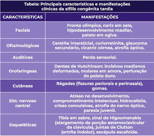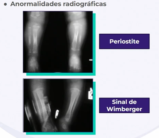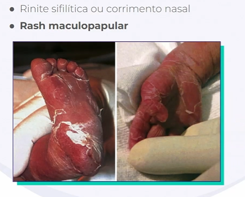 Infecção pelo T.Pallidum transmitida por via transplacentária hematogênica em qualquer fase gestacional, diagnóstico é baseado nos sintomas que a maioria dos infectados apresenta ao nascer, como alterações radiológicas (periostite e osteocondrite) de LCR e hematológicas (anemia, leucocitose e monocitose)