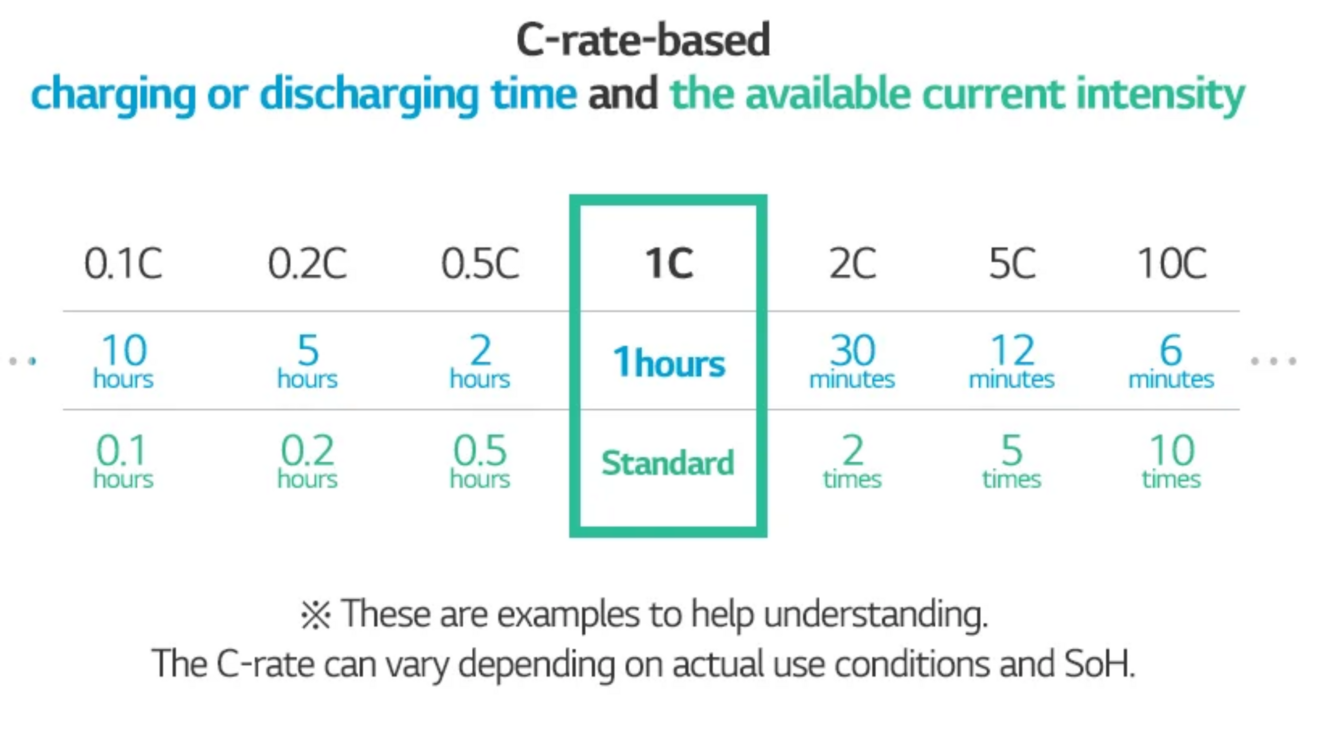 Speed of charge/discharge relative to capacity (1C = full charge in 1 hr)