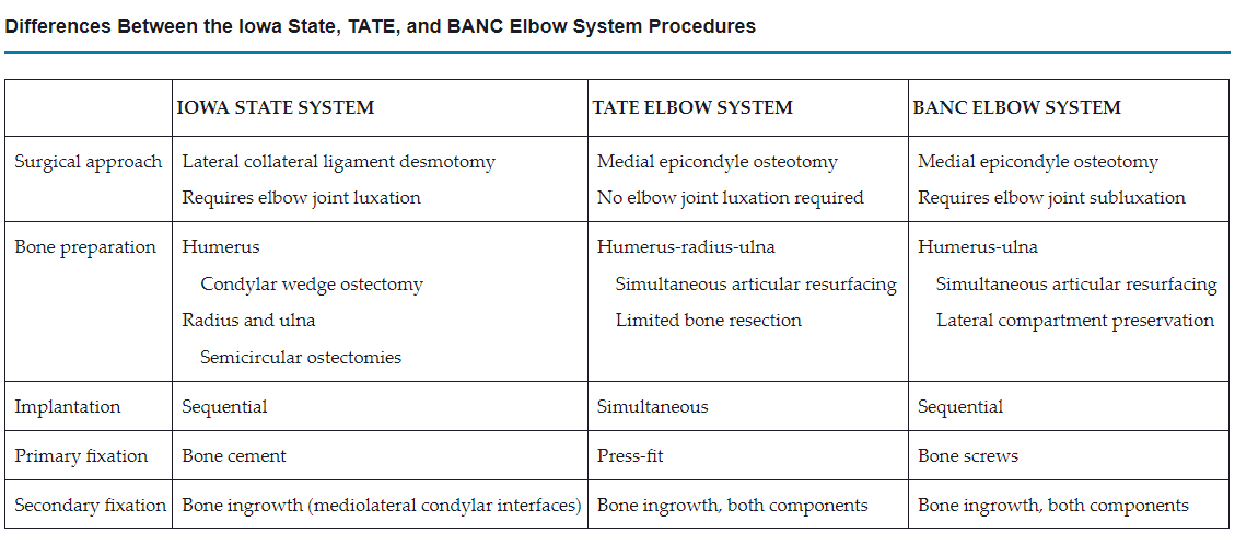 What are the main differences in the surgical procendures for the Iowa state, TATE and BANC elbow replacements?