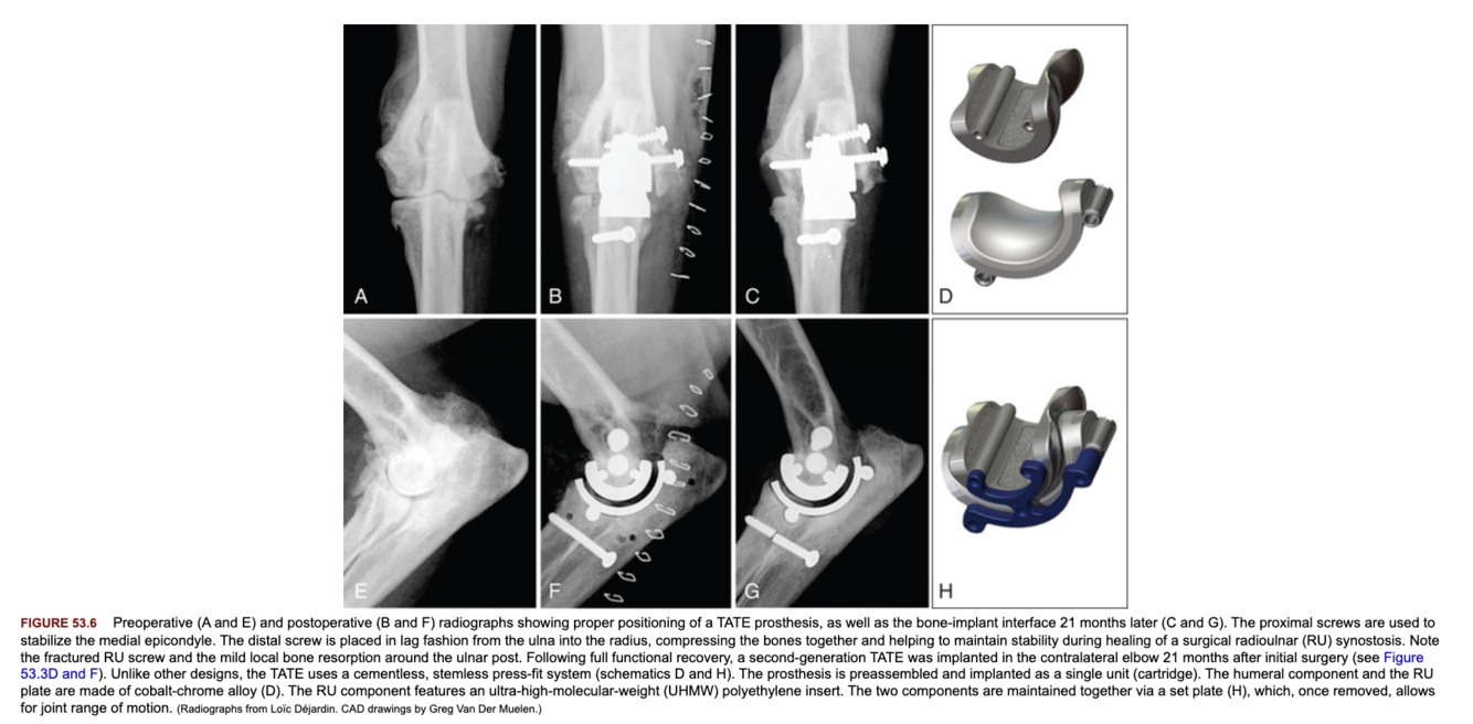 The humeral stem has a porous surface to allow oseointegration. The radioulnar component is cemented.