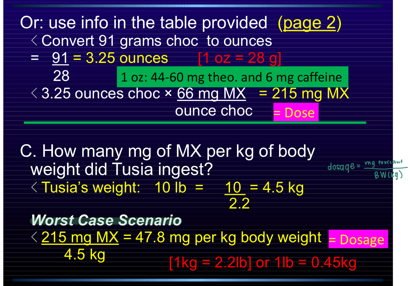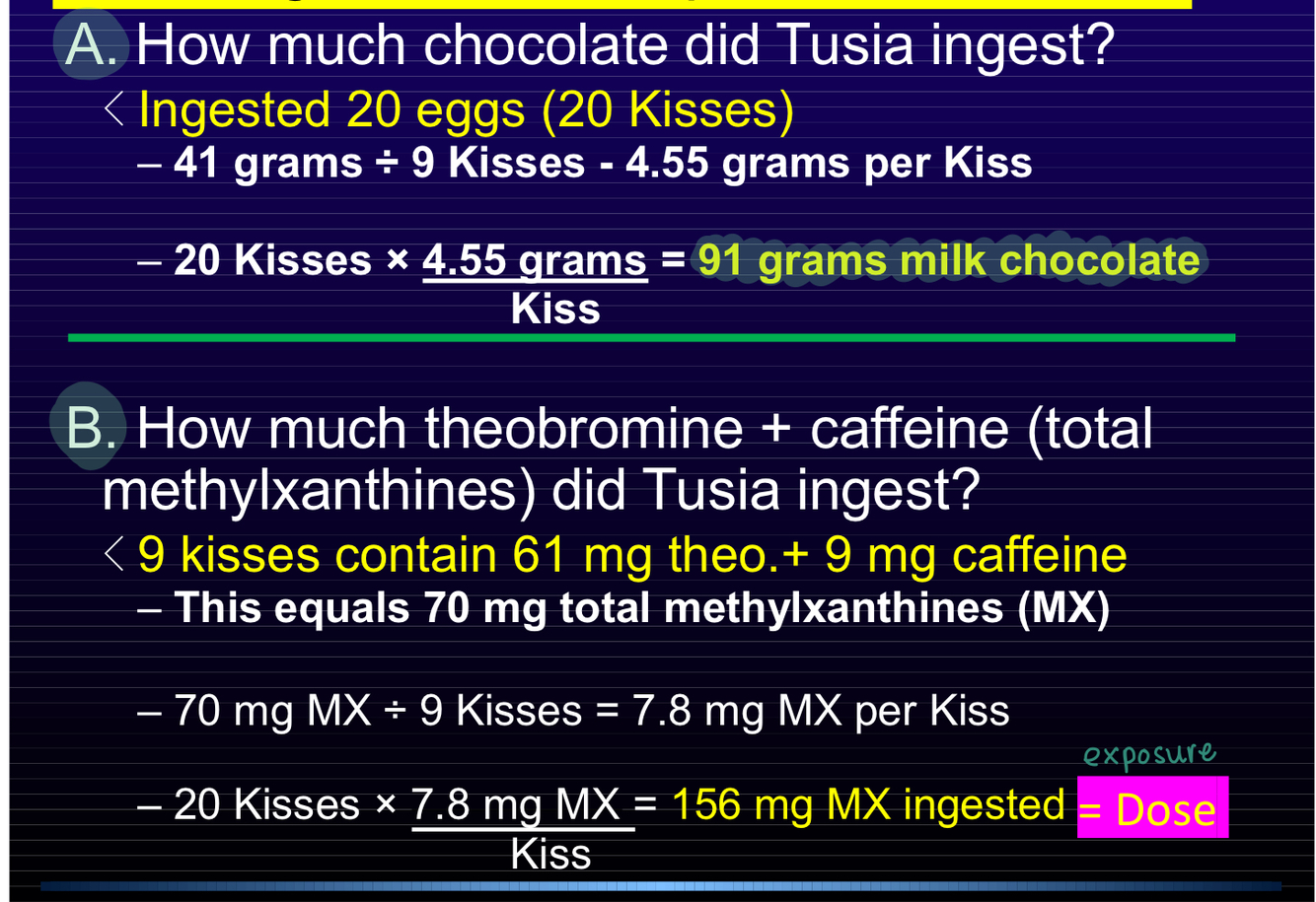 Tusia’s owner believes she ate 10-20 eggs. How much theobromine and caffeine was Tusia exposed to in ounces? What was the dosage of total methylxanthines?