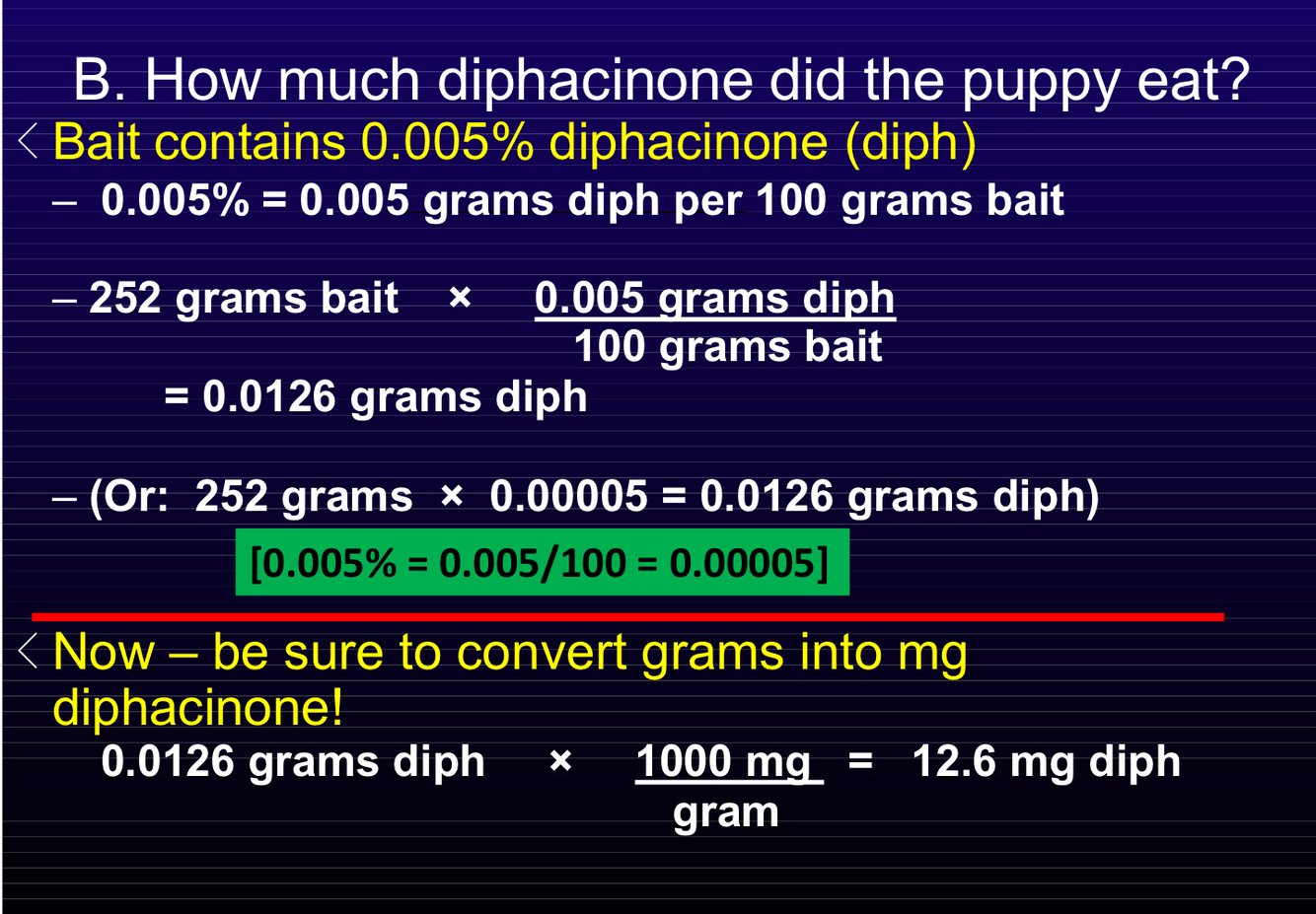 The active ingredient in the bait is diphacinone and makes up 0.005% content. How much diphacinone did the puppy eat?