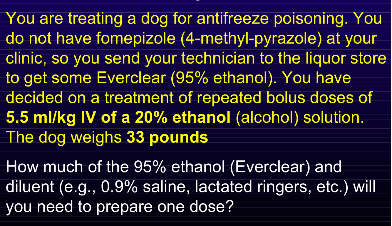 15 kg x (5.5mL/kg) = 82.5 mL of 20% solution per dose