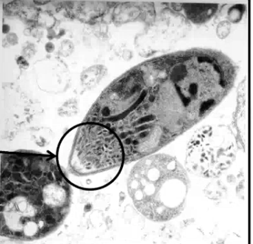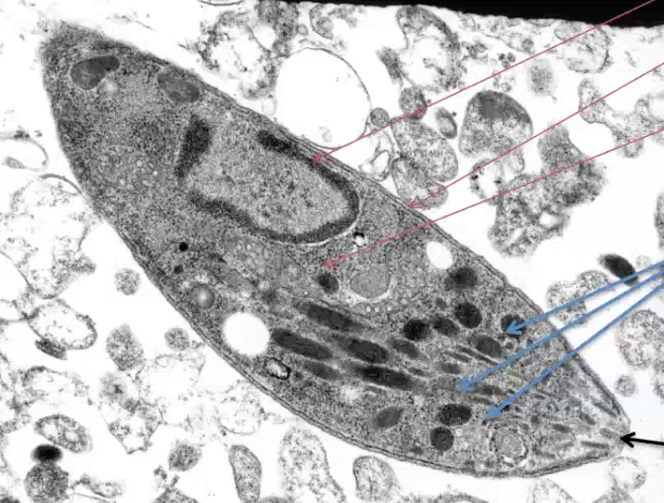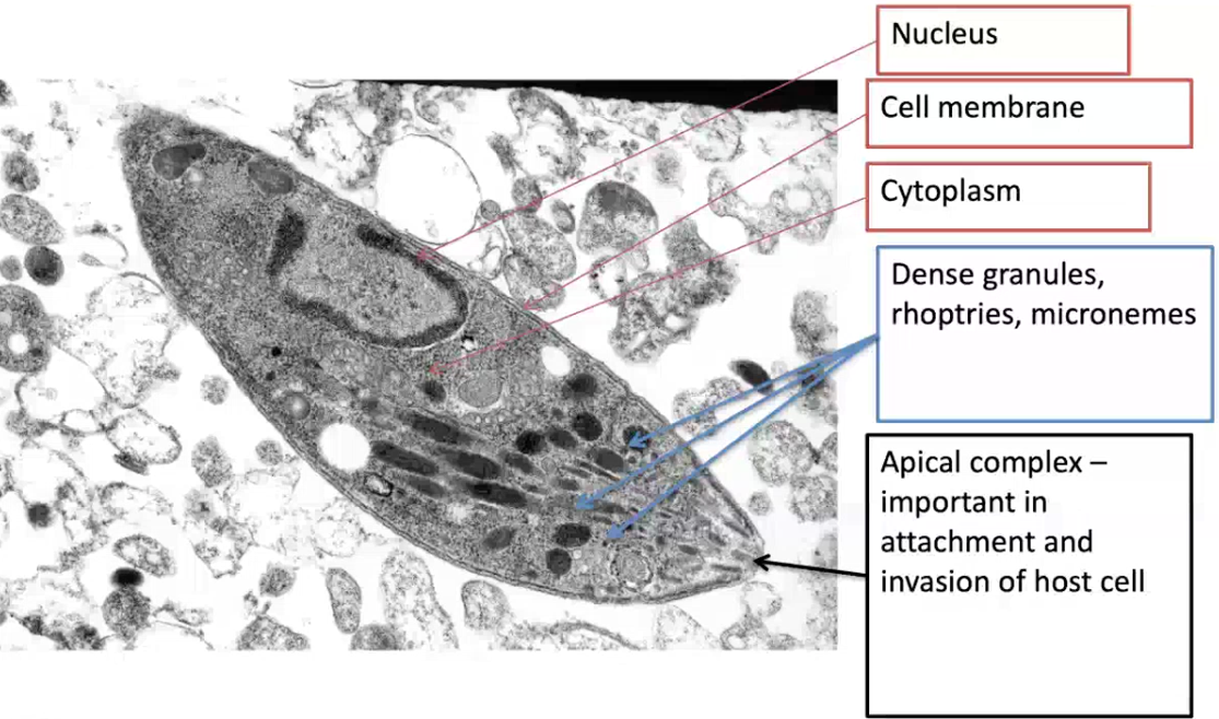 Tachyzoite- intracellular, rapidly dividing, crescent shaped, 2x6um