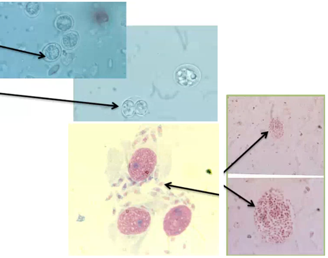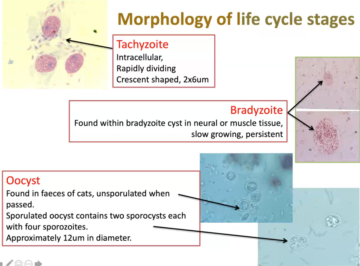 Oocyst- found in cat faeces, unsporulated when passed, sporulated oocyst contains two sporocysts each with four sporozoites- 12um in diameter