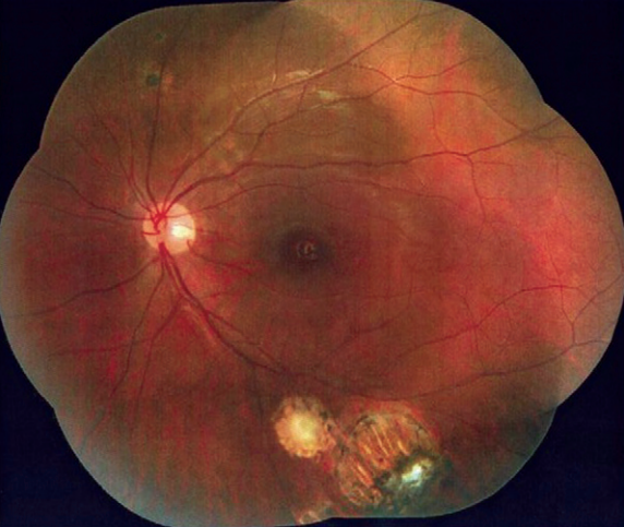 Fundoscopia c/ lesões sugestivas de coriorretinite por Toxoplasmose.