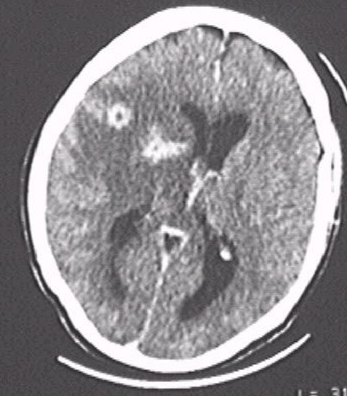 TC de crânio c/ lesão sugestiva de Neurotoxoplasmose.