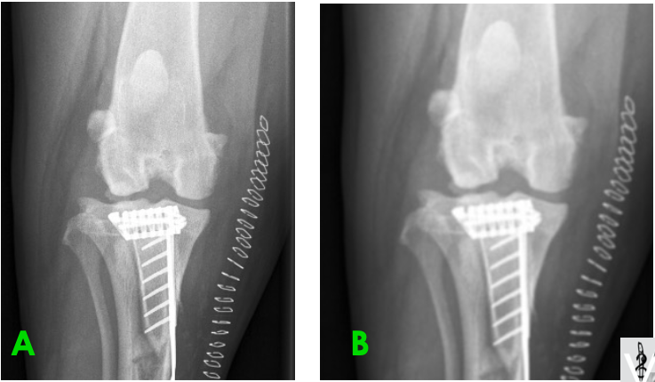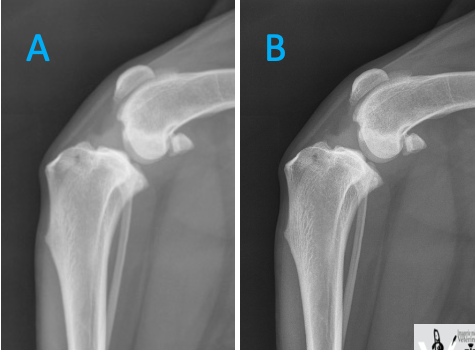 B : on y voit mieux les rebords osseux. Ici, c’est une partie du corps immobile et on peut se permettre d’augmenter le temps afin de diminuer le mA et donc le filament.