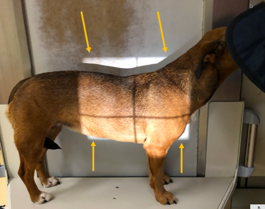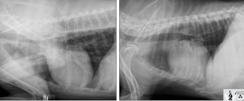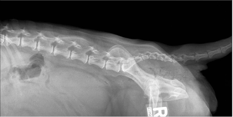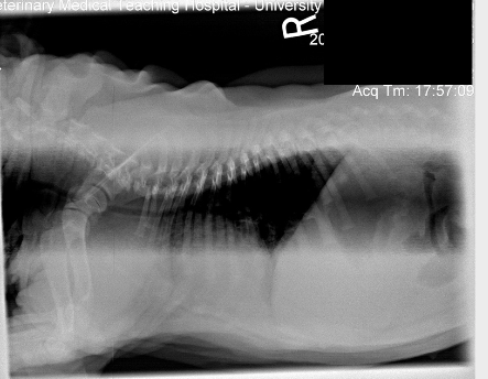 Anamnèse : Elkhound norvégien, femelle, 16 ans, présentée pour faiblesse et ataxie des membres pelviens.