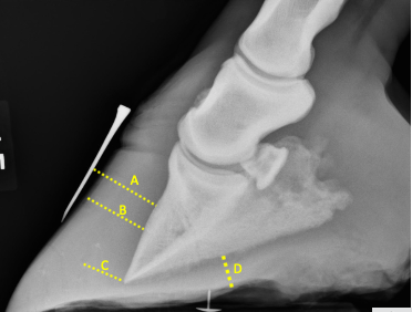 Je pense que le cheval a de la fourbure et pour le confirmer, je désire mesurer la distance entre la muraille et P3. Quelle ligne représente le mieux la distance désirée?