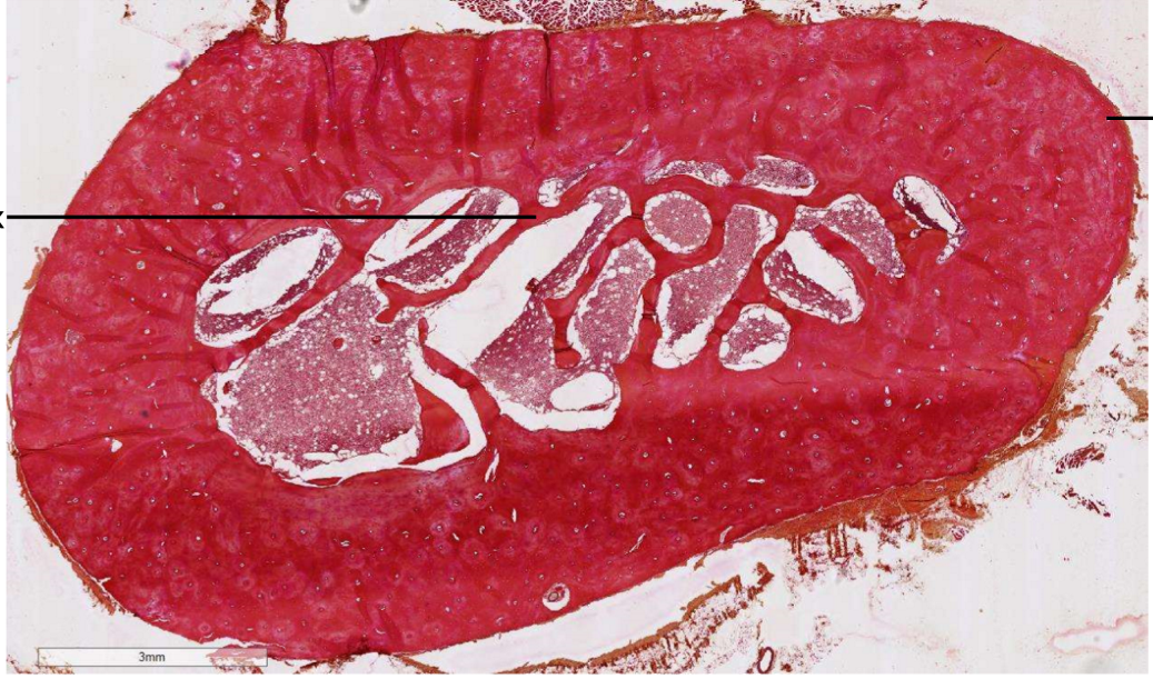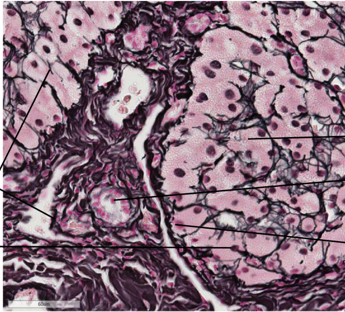 on y retrouve des fibres réticulés (collagene type 3) peu visible dans cette coloration surtout autout du vaisseau et au niveau de la charpente