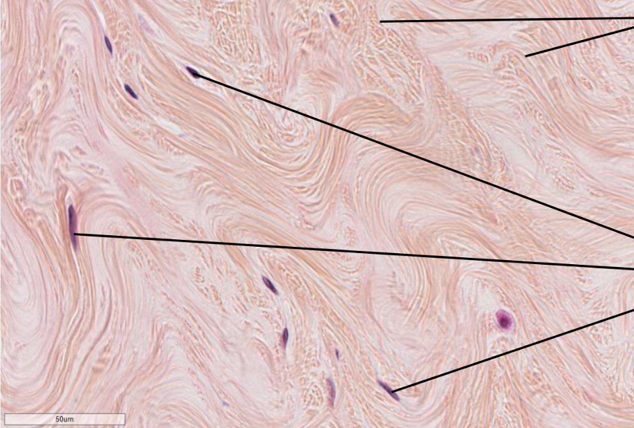 dense: peu de cellules et de subst fondamentale, beaucoup de fibres de collagène