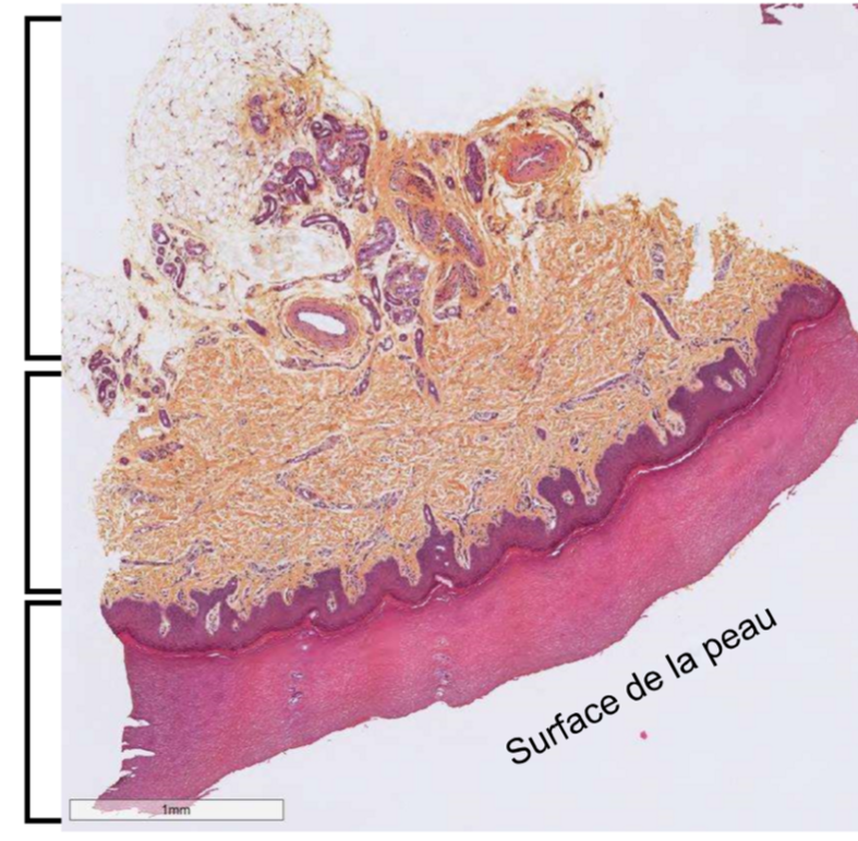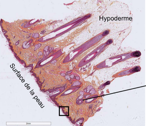 on voit dans le carré la couche corné de l’épiderme avec l’épiderme et le derme (en orangé)