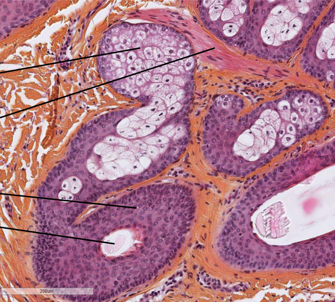 On voit ici la lame de cuir chevelu en HES encore mais zoom sur les annexes cutanés