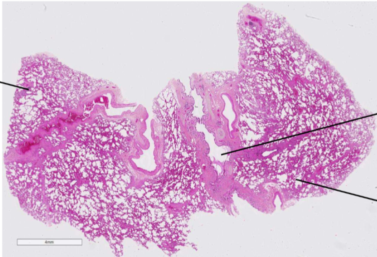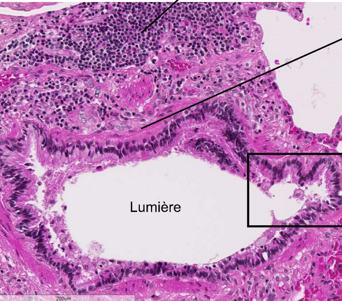 carré: diminution de la hauteur de l’épithélium respiratoire, diminution du nombre de cellule caliciforme, présence d’un chorion avec fibres élastiques