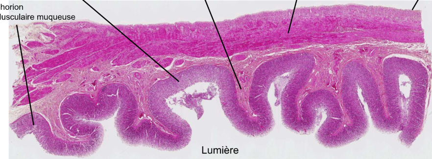 mauve: muqueuse (épithélium, chorionm musculaire muqueuse)