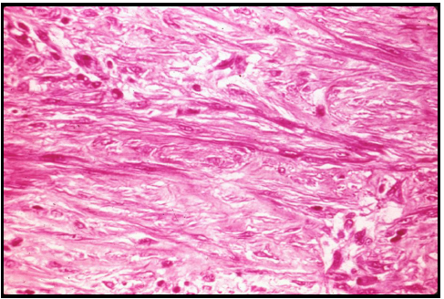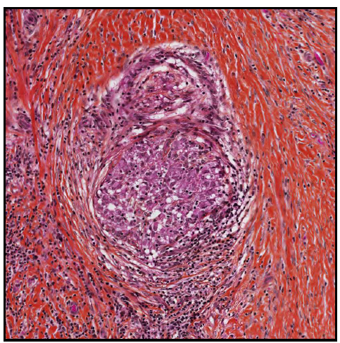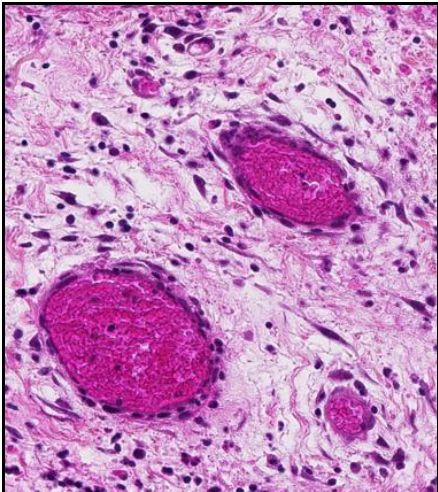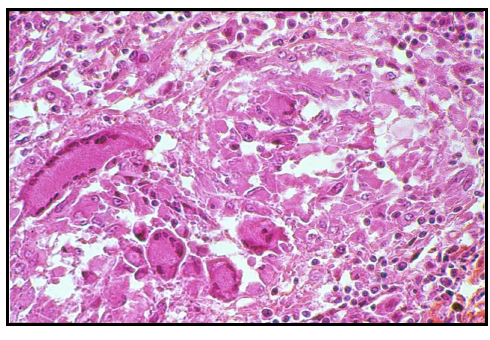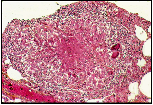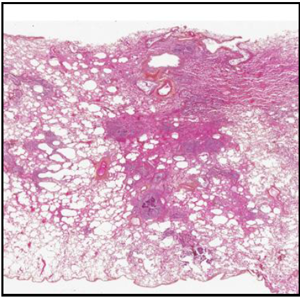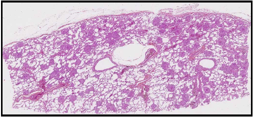 À faible grossissement, on note que le tissu pulmonaire est parsemé de petits nodules, les granulomes