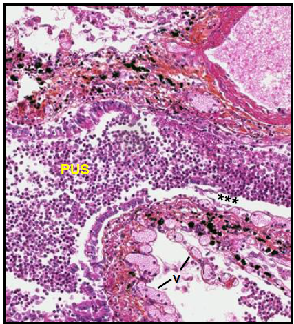 Bronchopneumonie Certaines alvéoles contiennent un liquide rosé, qui correspond à de l'oedème (exsudat séreux). Enfin les vaisseaux sanguins (v) sont dilatés et congestifs.