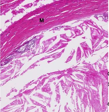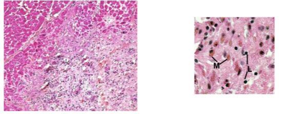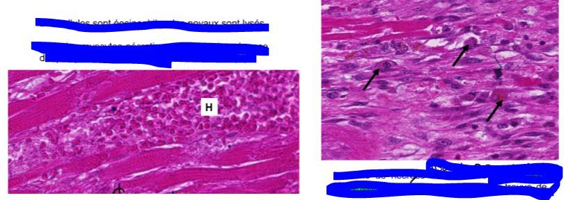 1. myocytes nécrotiques , entre eux on peut voir une hémorragie , les cellules sont éosinophiles et lesées