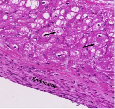 sous la couche endocardique, cellules entrain de mourir par hypoxie (mort vacuolisé)