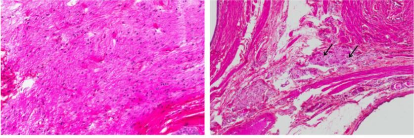 gauche: nodule riche en cellule tumorale et lymphocyte qui est entouré de bcp de tissus conjonctif