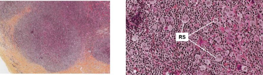 droite: cytoplasme abondant, grosse cellules multinucléaire , volumineux nucléoles ce sont les cellules de Reed-Sternburg