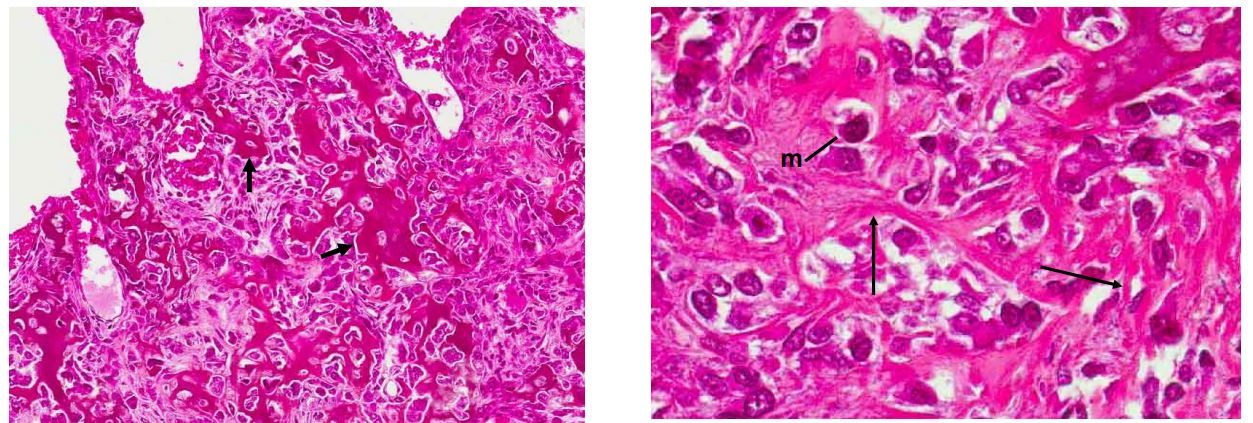 2.groupes d’ostéoblastes tumoraux séparés par tissu ostéoide néoformé (flèche) et mitoses et atypies cellulaires