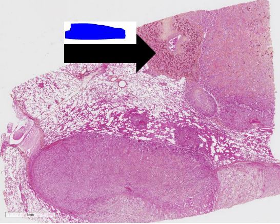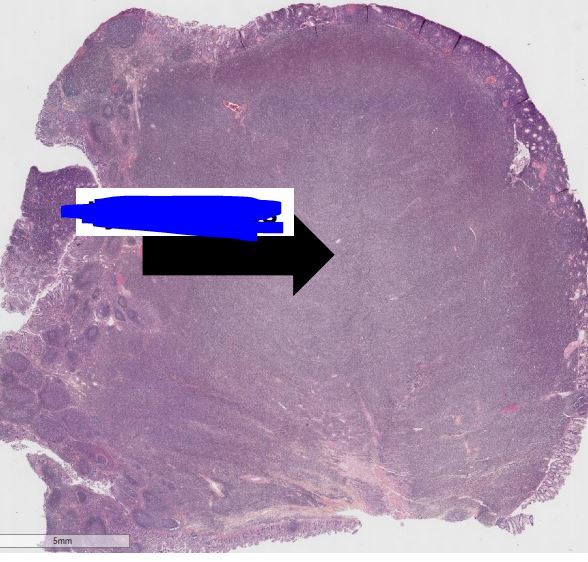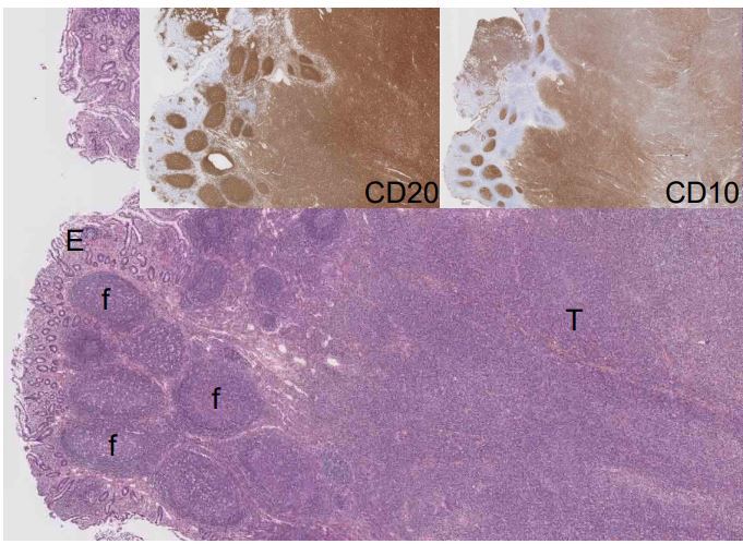 on peut voir l’épithélium du colon (E) et présence de follicule lymphoide normaux (F)