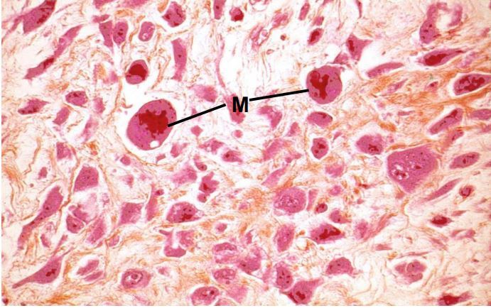 Nodule tumoral avec cellules tumorales ostéoides avec foyers calcifiés