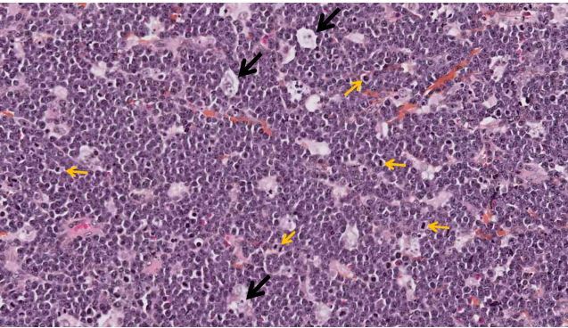 ciel étoilé tellement de lymphocyte et étoiles = macrophages (fleche noir)