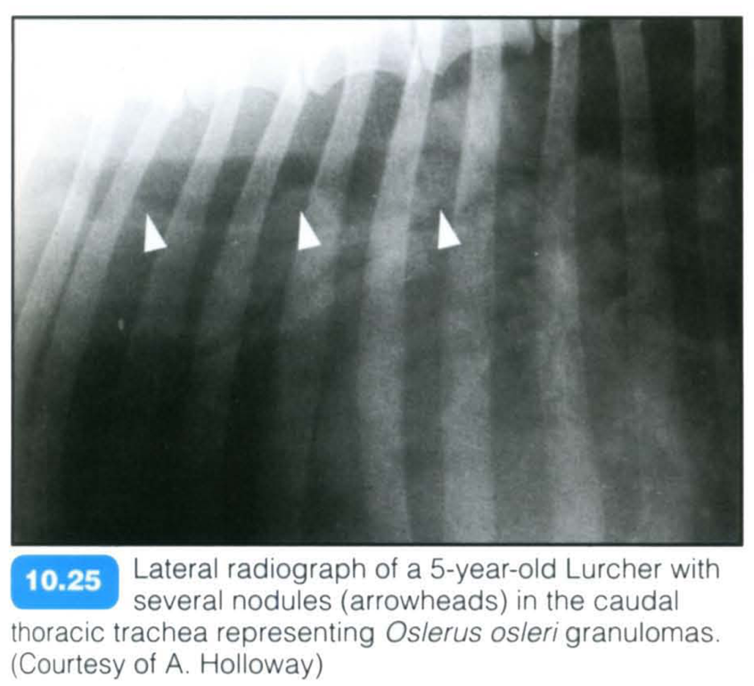 This parasitic infection (previously known as Filaroides osleri) is relatively rare nowadays and is usually identified in dogs less than 2 years old, in particular in kennelled dogs, such as Greyhounds.