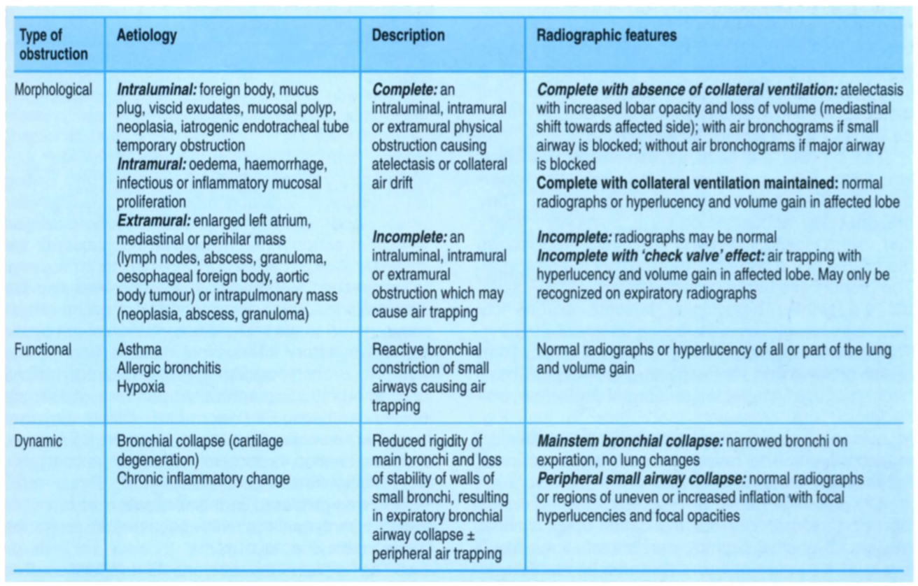 The radiographic features of bronchial obstruction depend on the location and degree of the obstruction, the effectiveness of collateral ventilation and the chronicity of the condition.