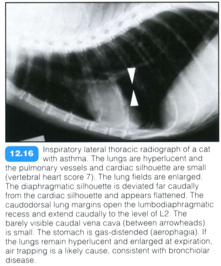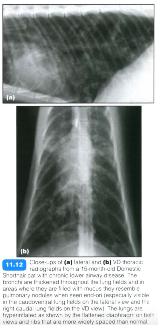 Feline chronic lower airway disease encompasses a multitude of small airway diseases in the cat including feline asthma. Inflammation of the airways leads to a reversible obstruction to airflow (functional obstruction) and hence air trapping. The obstruction is due to a combination of bronchoconstriction, bronchial wall oedema and submucosal gland hypertrophy.