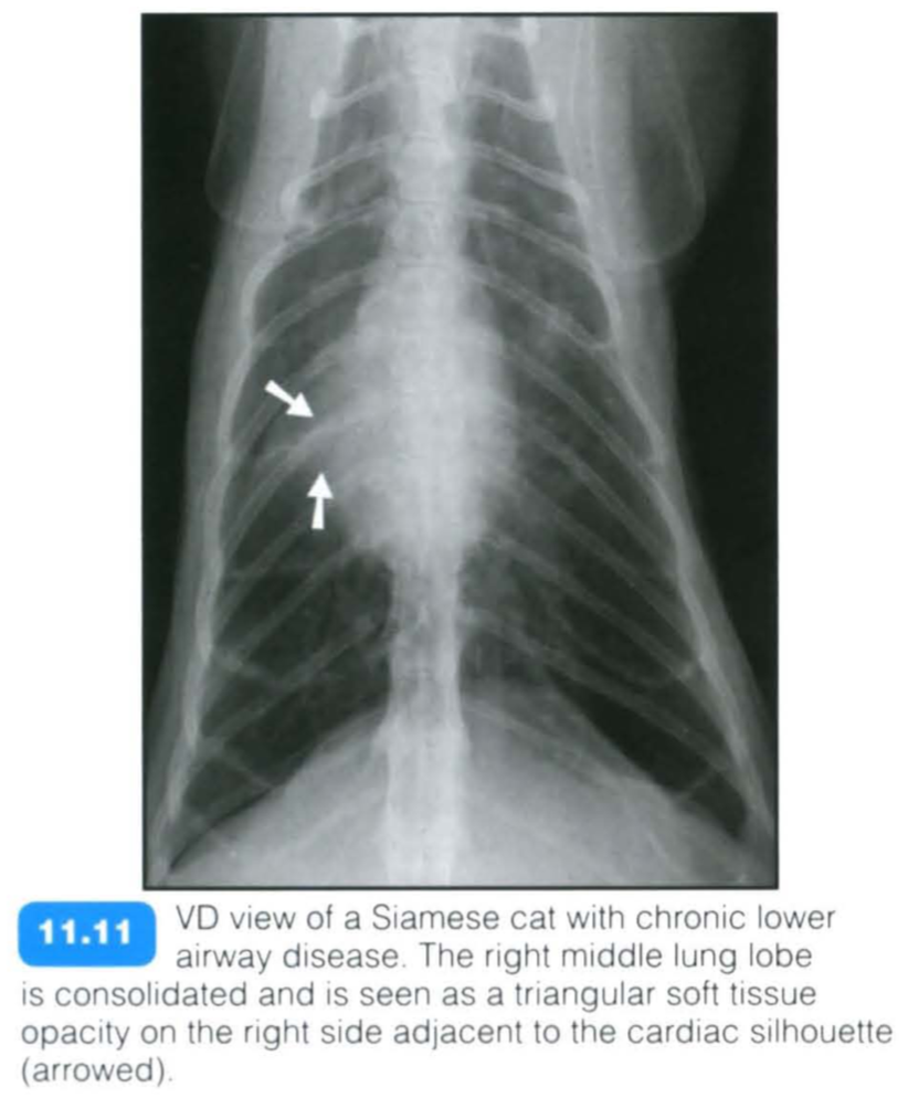 Clinical signs vary from chronic coughing and wheezing to severe respiratory distress. The condition can affect cats of any age with Siamese appearing to have an increased incidence . Hyper-responsive airways and reversible airflow obstruction lead to a reduced airway diameter and increased airway resistance. The condition can be extremely severe in presentation and care should be taken when handling dyspnoeic cats.
