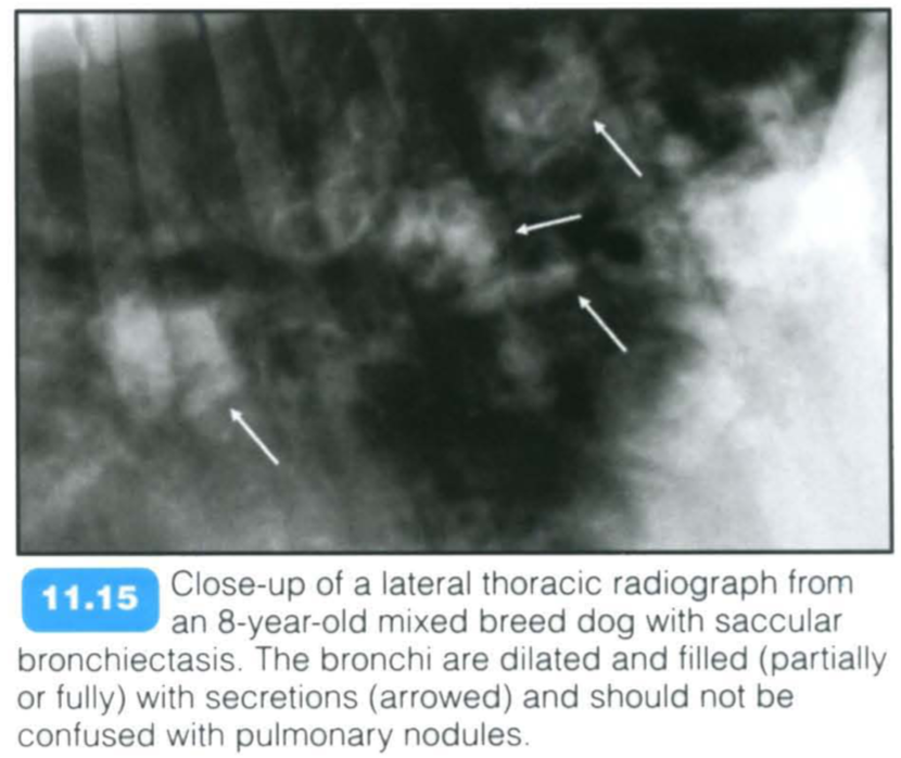 Dogs with bronchiectasis are commonly presented with a history of chronic productive coughing and recurring pneumonia that initially responds to antibiotics.