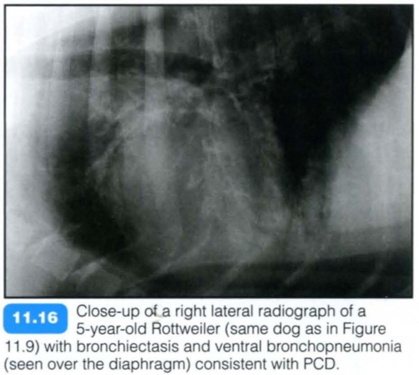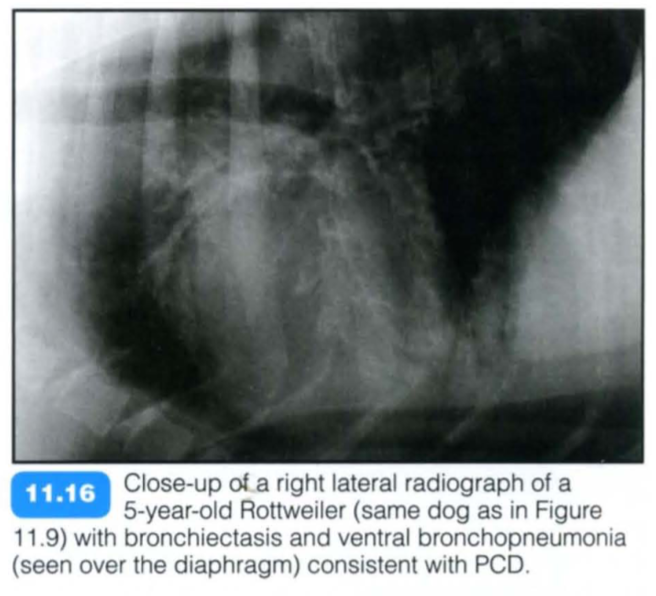 Primary ciliary dyskinesia (PCD), also known as immotile cilia syndrome, is a diverse group of inherited structural and functional abnormalities of the respiratory and other cilia, which results in recurrent respiratory tract infections in the dog. More specifically, PCD is an inherited defect in microtubule formation, affecting cilia of the respiratory and urogenital tract and the auditory canal.
