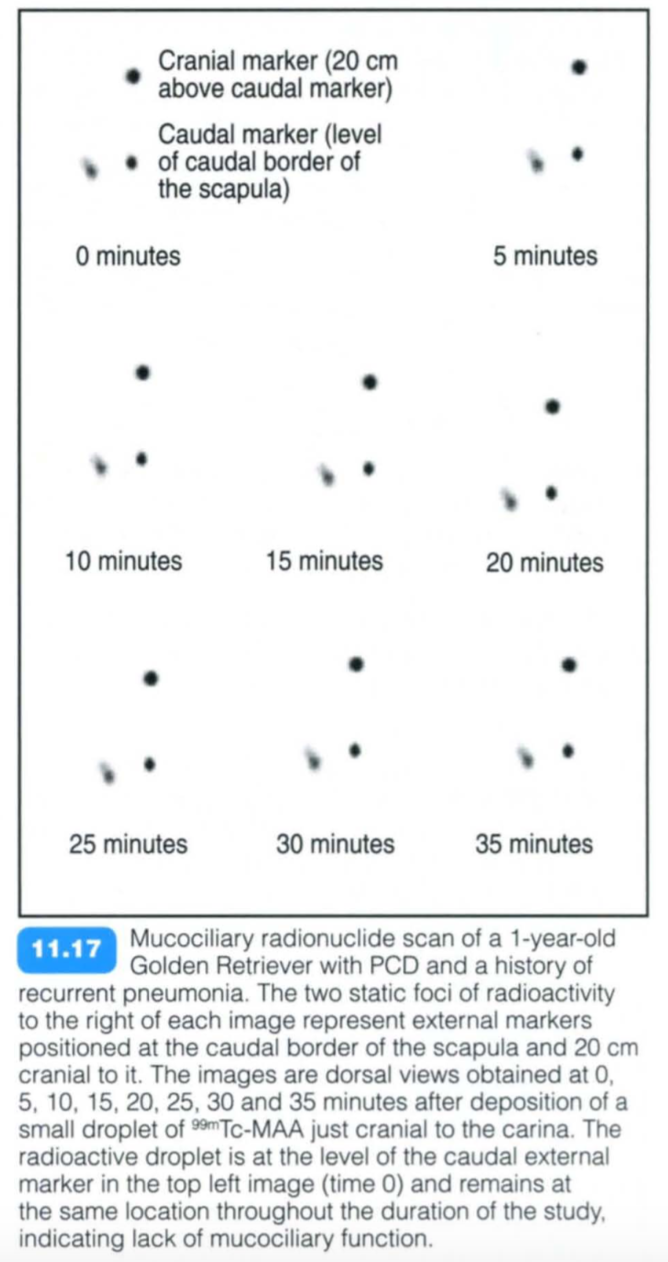 To perform a scintigraphic study (see Chapter 5) a droplet of 99mTc-MAA is deposited in the distal aspect of the trachea. The diagnosis is confirmed by the absence of movement of the radiopharmaceutical droplet throughout the scintigraphic study. It should be noted that droplet movement always indicates normal Ciliary function (Le. no false- negatives).
