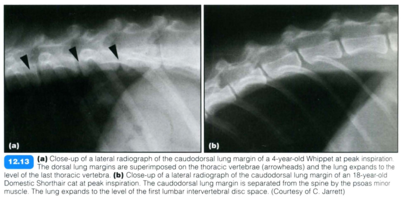 In lean dogs and cats, and in deep-chested dogs, the lungs tend to look very lucent. A close inspection with a highly luminescent light source should reveal normal bronchovascular structures and thereby differentiate this variation from a pneumothorax.