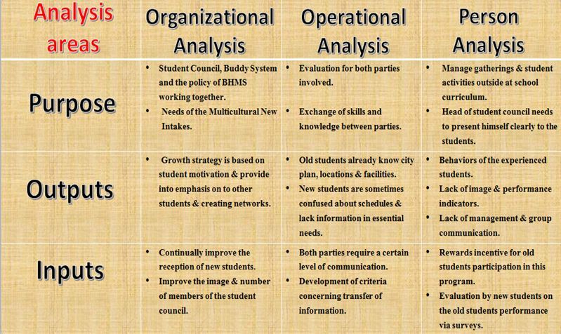Needs Assessment Table (Input-Output and Purpose for the individual, for the operation and for the organization).