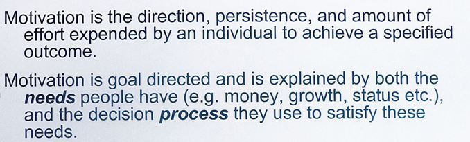 MOTIVATION: Is the direction, persistance, and amount of effort expended by an individual to achieve a specified outcome.