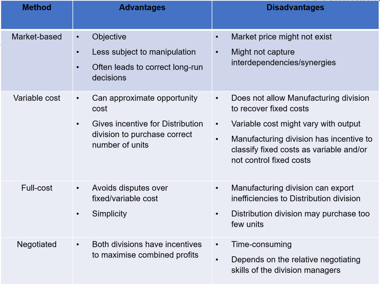 ‘On the same page’: transfer price should allow the manager to maximize overall company profit- while attempting to maximize profit in their own segment.