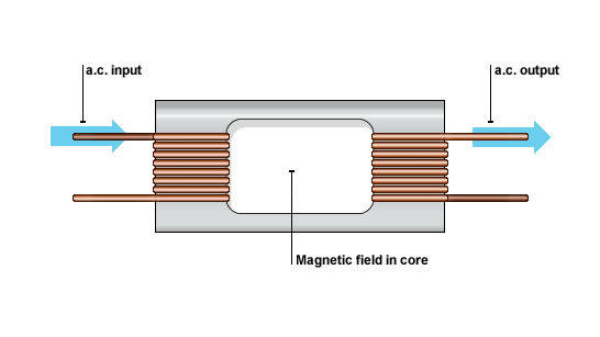 An ac voltage is applied to one coil (the primary coil). This causes a changing (alternating) magnetic field to be set up in the core. The other coil (the secondary coil) is in this changing magnetic field and so it has an ac voltage induced in it.