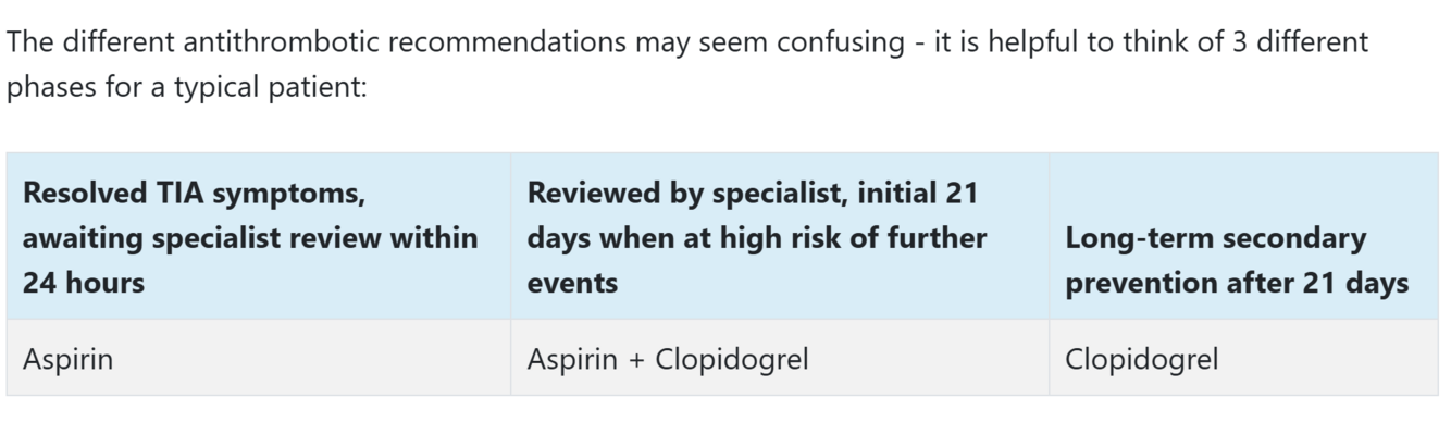 Clopidogrel + aspirin or ticagrelor + clopidogrel are recommended for patients within 24 hours of onset.