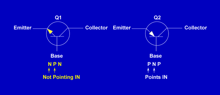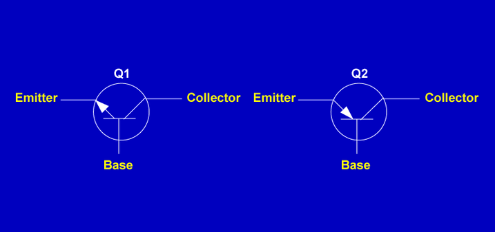 The direction of the arrow on the emitter indicates an NPN or a PNP transistor.
