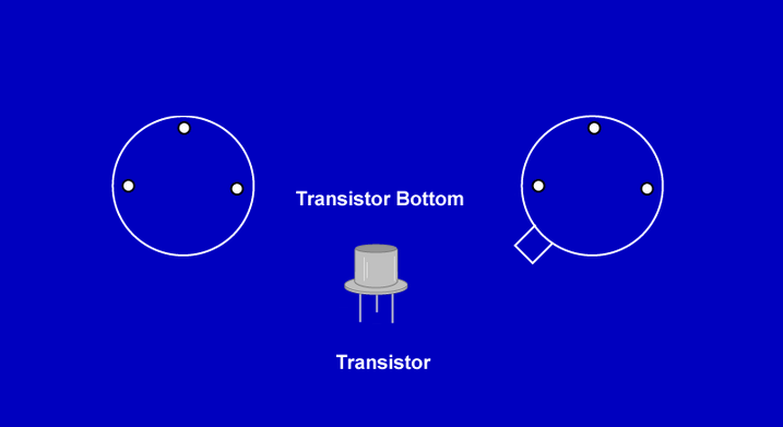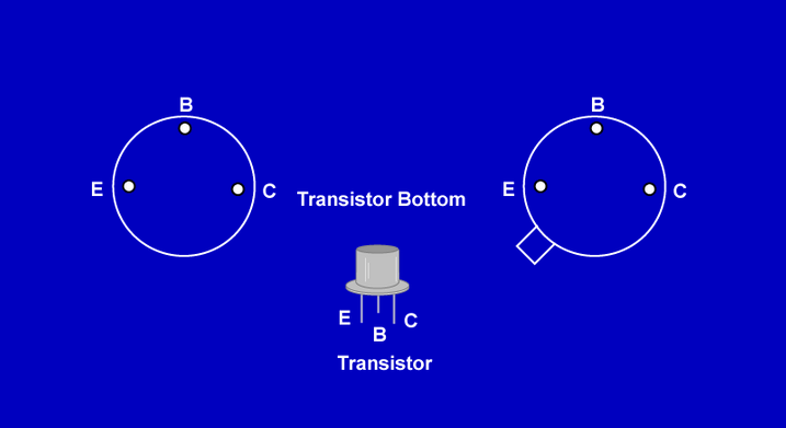 The emitter is on the left or next to a tab when the semicircle is the top half of the transistor viewed from the bottom.