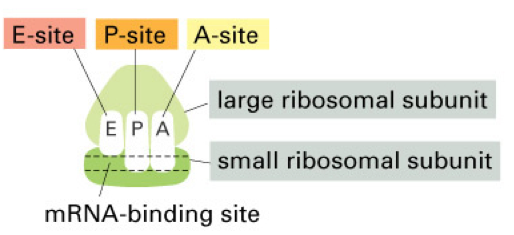 on the ribosomal subunit there are 3 sites 1: A site- aminoacyl-tRNA site 2: P site= peptidyl- tRNA site 3: E site- exit site Made up of a large ribsookmoal sub unit and small subunit