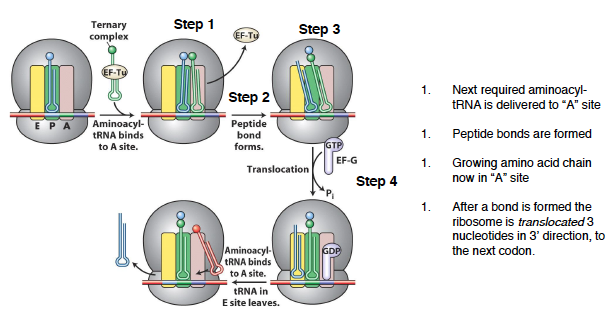 elongation involves the addition of amino acids to the carboxyl end of the growing chain - peptide bonds are formed between adjacent amino acids